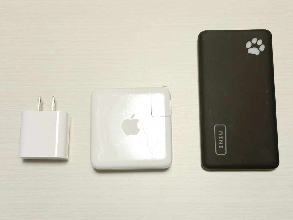 スマホ・ノートPCとしてMacBookを持ち歩くことを仮定すると、必要なものは、「スマホ用のアダプター」・「PC用のアダプター」・「モバイルバッテリー」となります。