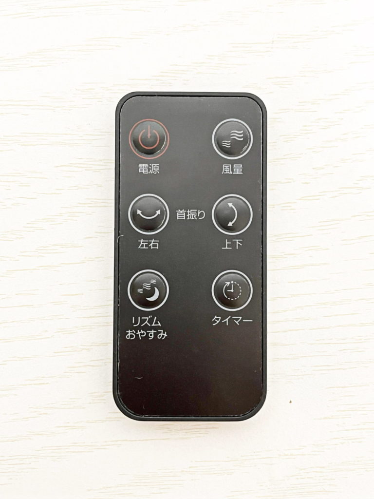 リモコンに設置されているボタンは6つで「電源」、「風量」「左右(首振り)」、「上下(首振り)」、「リズム(おやすみ)」、「タイマー」です。