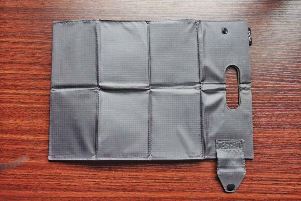 「パッタン」の最大の特徴は、「芯材」が組み込まれているところです。一般的な袋型エコバックとは異なり、8㎝×11㎝の薄い四角形の芯材が一定の間隔で並べられています。