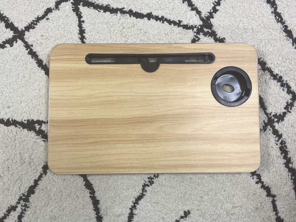 縦に長い窪みと飲み物が入るようの窪みがあるので、タブレットやコーヒーなどを置きながら作業をすることができます。