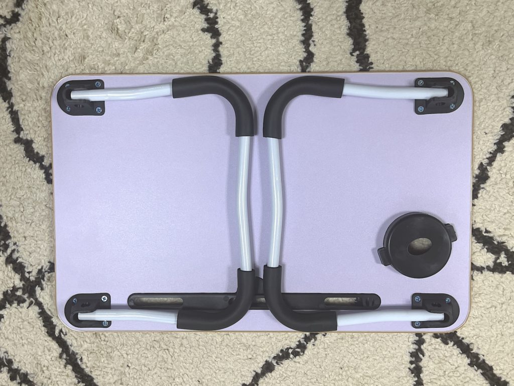 折り畳んだ状態だと腿(もも)にデスクの足の部分が当たってしまいますがPCの高さがちょうどいいです。開いた状態の使用は、PCがちょっと低めですね。