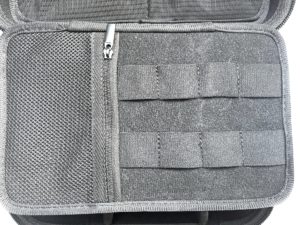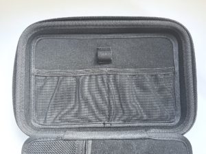 12×7センチほどのチャックのついた収納が1つあります。ここは特に小物に特化した収納です。メモリなどの紛失を防ぐことができます。変換器などの収納もできますので、私の場合はLightning(スマホの挿し口)からSDカードを読み込むことができるものを収納しています。